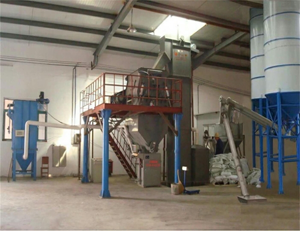 主要配置: 原料仓,自动计量配料系统及称重装置,斗式提升机,待混仓,高能无重力混合机,喂料机,成品仓,自动称量包装机,脉冲除尘器,支架爬梯平台,电器控制柜等组成。